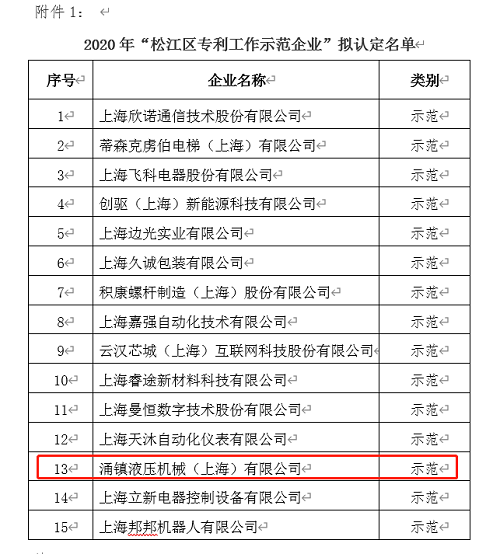 2020年涌鎮液壓成功入選“松江區專利示范企業”行列,并獲得立項。