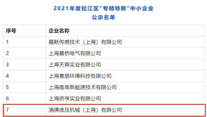 《松江區(qū)“專精特新”中小企業(yè)發(fā)展專項(xiàng)支持實(shí)施細(xì)則(2020年版)》(滬松經(jīng)〔2020〕165號),區(qū)經(jīng)委組織開展了2021年度松江區(qū)“專精特新”中小企業(yè)申報(bào)和復(fù)核工作。涌鎮(zhèn)液壓充分發(fā)揮自身優(yōu)勢,堅(jiān)持獨(dú)立自主的研發(fā)與創(chuàng)新設(shè)計(jì),憑借高效的產(chǎn)品創(chuàng)新能力和廣泛的市場認(rèn)可度,成功申報(bào)并獲得上海市松江區(qū)“專精特新”的稱號。